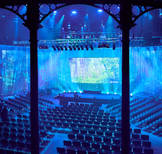 Furniture: theatre chairs or benches; slim side tables for water and notes; a lectern if needed.