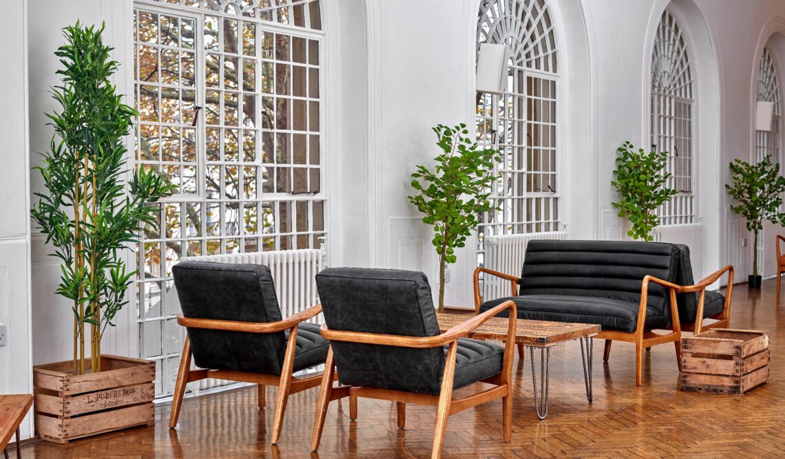 The tall arched windows at One Marylebone bring in an abundance of daylight, making greenery a natural choice for this shoot. Our premium eucalyptus potted plants add height, freshness and movement to each composition. They introduce a soft organic element that enhances the lounge setting without overshadowing the architecture.