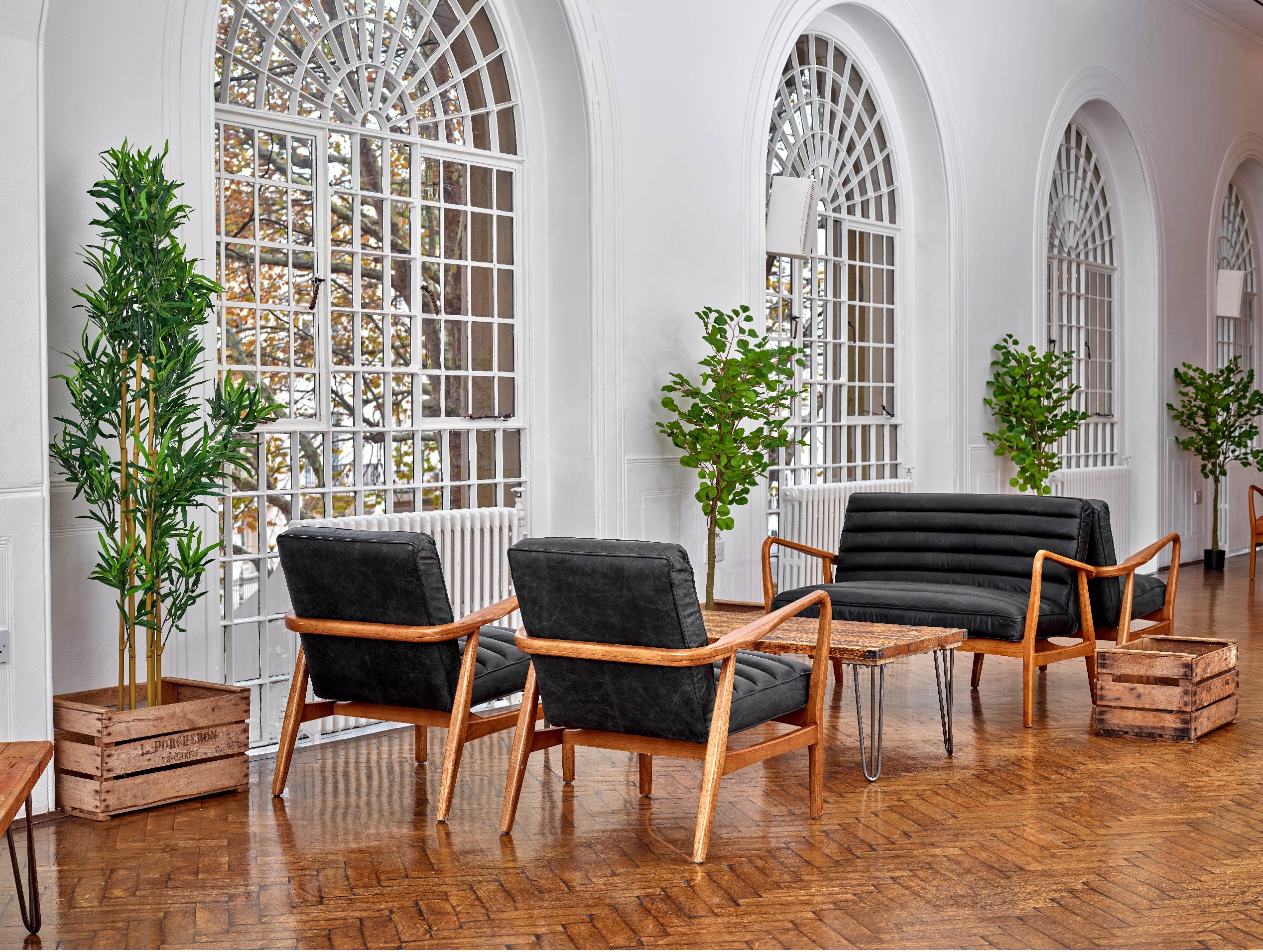 To pair with the Downtown seating, we selected the Hoxton coffee tables. These feature a rustic reclaimed wood top combined with industrial hairpin legs. The mixture of raw texture and clean lines creates a striking balance inside a grand heritage venue. Hoxton tables are ideal for anyone searching for event furniture hire London that balances practicality with design character.